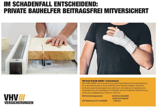Demnach sind über die private Unfallversicherung bei der VHV zunächst alle versicherten Personen geschützt. Darüber hinaus besteht während der Dauer eines privaten Bauvorhabens auch Versicherungsschutz für maximal 4 Bauhelfer. Vorausgesetzt es handelt sich um ein privates Bauvorhaben vom Versicherungsnehmer.